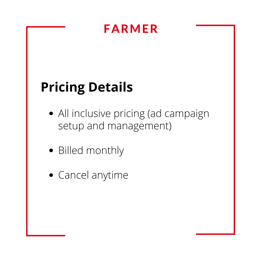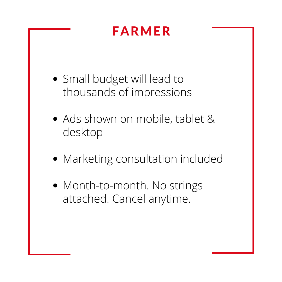 How Much Would You Like To Spend? | $198/mo – (50,000 – 70,000 Impressions), $298/mo – (70,000 – 100,000 Impressions), $398/mo – (100,000 -130,000 Impressions), $498/mo – (130,000 – 160,000 Impressions), $598/mo – (160,000 – 200,000 Impressions) |